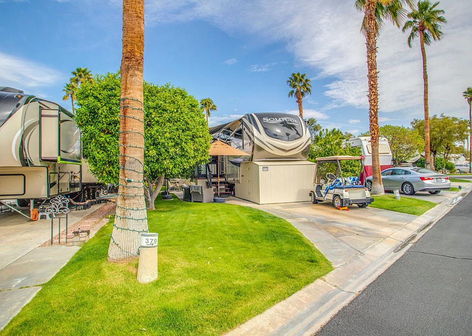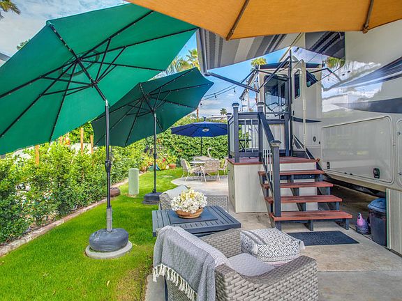 Beautiful package of lot and RV that includes a 2021 Grand Design Solitude with a rear kitchen which is perfect for the lot. This almost new RV includes a dishwasher, washer & dryer, steps & a built on storage shed. The lot is located on a quiet destination street very close to satellite C.Outdoor Resorts Palm Springs is a Five Star RV Resort Community combining luxury with affordability. It is a guard gated resort that sits on 137 beautifully landscaped acres with 27 holes of executive golf, 10 tennis courts, 13 pickleball courts, 8 swimming pools, a fully equipped fitness center, espresso bar, sports bar, beauty salon/barber shop, full-service restaurant, convenience store, 2 club houses, activities, special events and so much more.