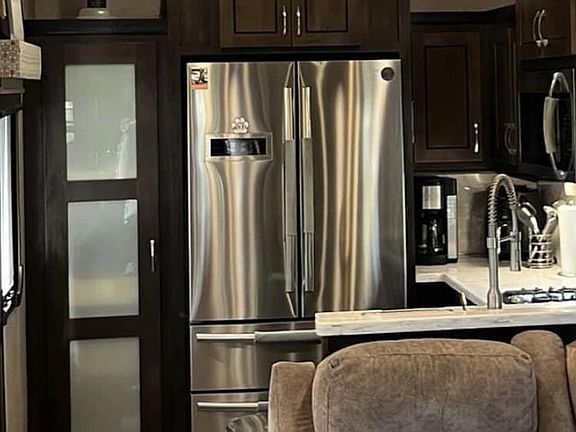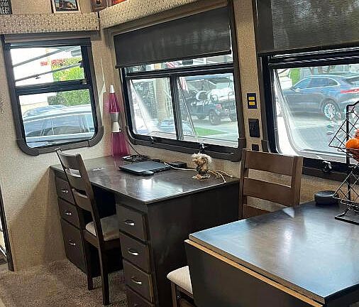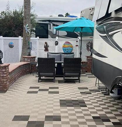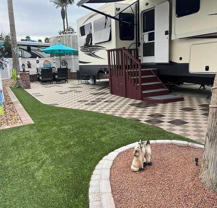 Lovely package deal featuring a 2019 Forest River Cedar Creek RV move in ready for the season.This location is walking distance to Satellite B and La Palma clubhouse. Very low maintenance lot with artificial turf, modular decking, fencing and a sunny morning location.RV includes a residential refrigerator, dishwasher, bath and 1/2, walk in closet and king bed. Completing this package is a custom built dog house storage and steps.