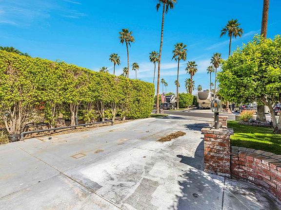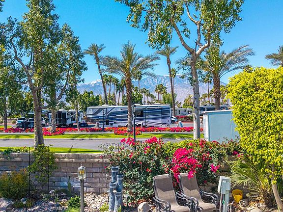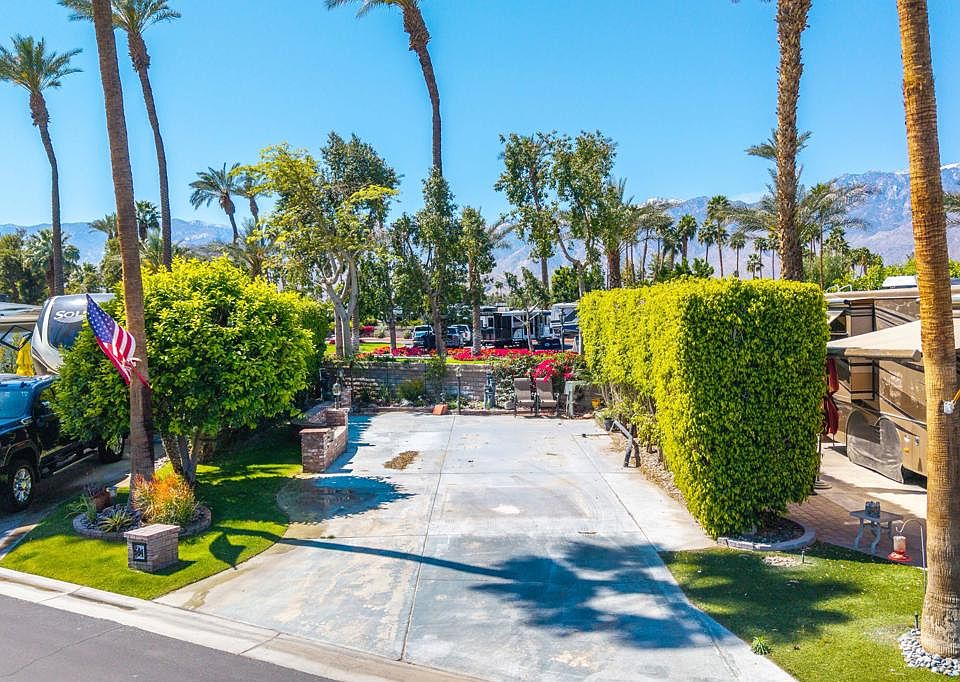 Discover a serene escape on this beautifully expanded wall lot. Perfectly positioned near the resort's entry/exit and the vibrant La Palma Clubhouse, this property offers both convenience and tranquility. Mature hedging on both sides creates a private and secluded outdoor living space, ideal for relaxation and entertaining. The rear of the lot provides stunning, unobstructed mountain views, offering a picturesque backdrop for your desert lifestyle. Outdoor Resorts Palm Springs is a Five Star RV Resort Community combining luxury with affordability. It is a guard gated resort that sits on 137 beautifully landscaped acres with 27 holes of executive golf, 10 tennis courts, 13 pickleball courts, 8 swimming pools, a fully equipped fitness center, espresso bar, sports bar, beauty salon/barber shop, full-service restaurant, convenience store, 2 club houses, activities, special events and so much more.
