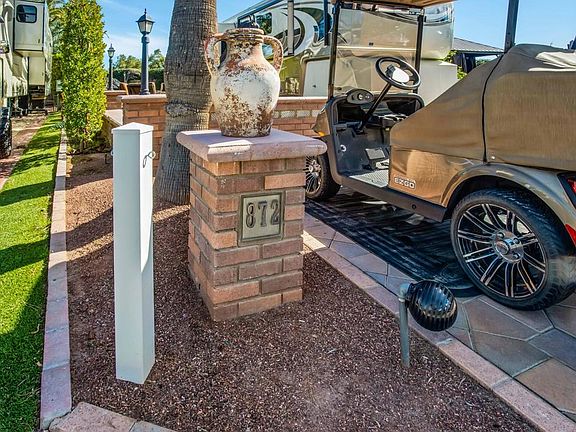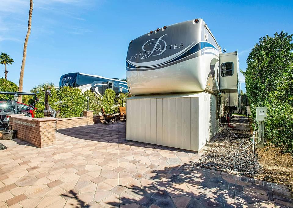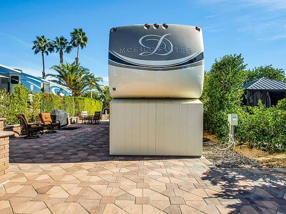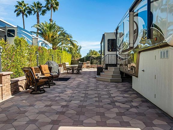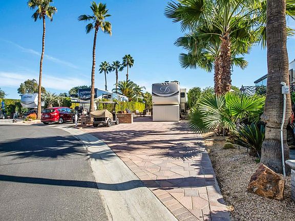 Indulge in luxury living with this exceptional lot. Situated on one of the largest lots in the resort, this expansive retreat boasts an extended patio with pavers, perfect for entertaining. Privacy is ensured with hedges on both sides and a large greenbelt behind. Experience the epitome of upscale RV living in this stunning location and oasis.Outdoor Resorts Palm Springs is a Five Star RV Resort Community combining luxury with affordability. It is a guard gated resort that sits on 137 beautifully landscaped acres with 27 holes of executive golf, 10 tennis courts, 13 pickleball courts, 8 swimming pools, a fully equipped fitness center, beauty salon/barber shop, full-service restaurant, convenience store, 2 club houses, activities, special events and so much more.