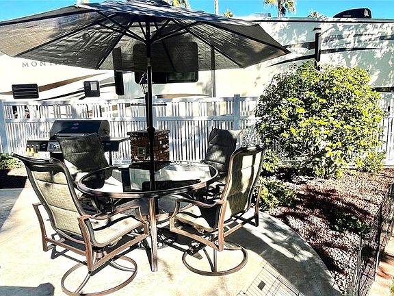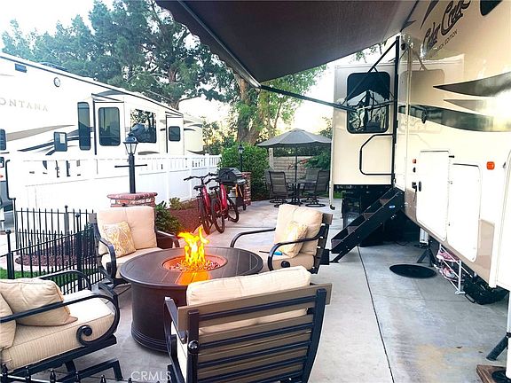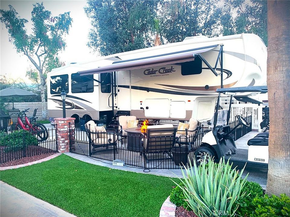 Wonderful updated lot on the South Wall with shade trees at the back, low maintenance landscaping, a 2018 Cedar Creek Silverback Edition Fifth Wheel fully furnished, 2011 EZGO Golf Cart with new batteries, patio table w/4 chairs & umbrellas, BBQ, large firepit w/4 extra plush padded chairs and storage box. Walking distance to the pool/spa, laundry & shower rooms at satellite E, a short walk to the El Saguaro Club House, Owners Lounge, Pickle Ball Courts. Outdoor Resorts palm Springs is a Five Star RV Resort Community combining luxury with affordability. It is a guard gated resort that sits on 137 beautifully landscaped acres with 27 holes of executive golf, 10 tennis courts, 13 pickleball courts, 8 swimming pools, a fully equipped fitness center, espresso bar, sports bar, beauty salon/barber shop, full-service restaurant, convenience store, 2 club houses, activities, special events and so much more.