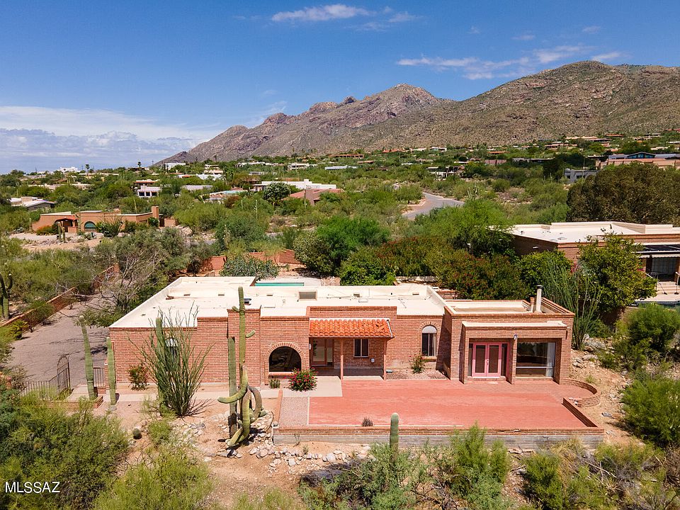 Nestled in the Catalina Foothills, this home enjoys unparalleled mountain and city views! Location is ideal - walking distance to La Encantada and Manzanita Elementary, minutes from multiple hiking trails and only 7 miles to UA campus. Spacious primary bedroom has its own sitting room/office. Living room and large family room each have their own fireplace. Saltillo Tile and Mortar Washed Adobe. Brick patio and lush fenced pool area boast spectacular mountain views. Property is fenced and walled for privacy and to keep out desert critters, with mature trees and desert landscaping.