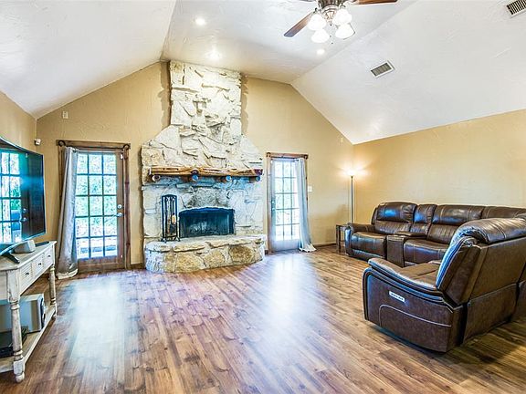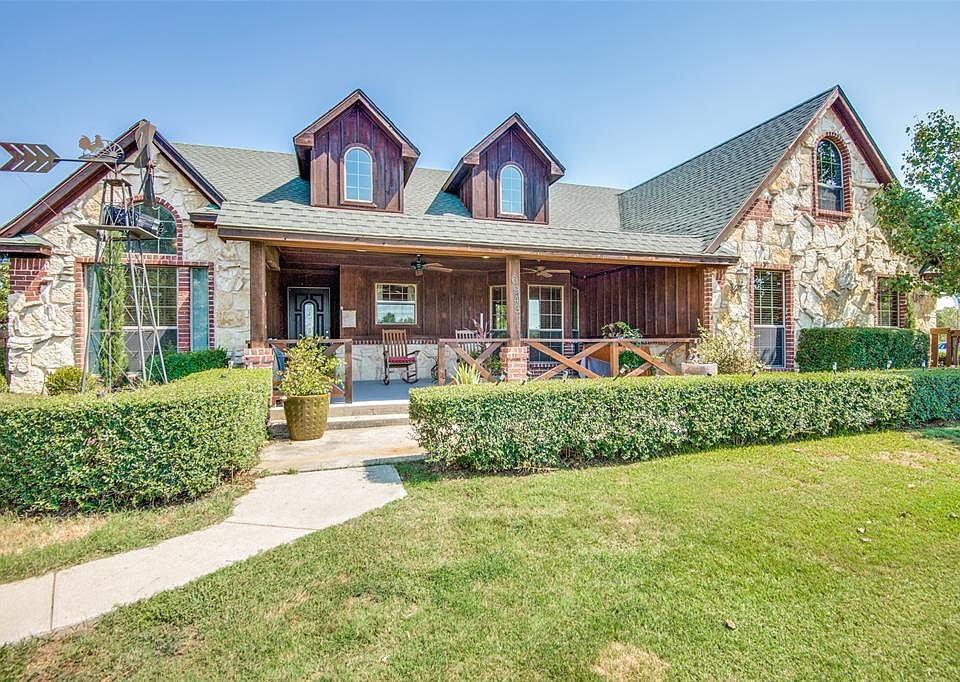 Beautiful custom home with stone and cedar exteriors on 2.849 acres! Amazing views from the Gazebo on back of property. Offering 3 bedrooms,2 baths and a 2 car carport. Beautiful Redwood cedar and pine trim throughout. Master bedroom with stain concrete floors,garden tub and separate shower. Kitchen with custom cabinets ,gas range and breakfast bar. Spacious living area with a stone, wood burning fireplace. Upstairs bonus room could offer a second living area or media room. Game room down with built in cabinets, stained concrete floors and wet bar. Covered patios front and back for the perfect evening entertaining.10x12 Storage building on side of home for extra storage. Great location and easy commute to DFW.