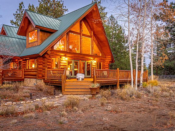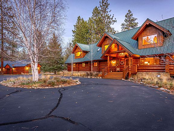 Beautiful log home on 5.62 private acres just minutes from downtown Sisters and public lands. Enjoy manicured landscaping surrounded by ponderosa pines and aspens. A covered porch welcomes you to a four-bedroom home featuring an open floor plan with a 30' vaulted great room, soaring windows, and a floor-to-ceiling stone fireplace showcasing warmth and craftsmanship. The updated entertainer's kitchen opens to a wrap-around cedar deck with a hot tub and private sitting areas. Upstairs offers a loft/sitting area, spacious primary suite, two bedrooms, and a full bath. The finished 1,152 sq ft basement includes a family room and storage. Two large garages, a professional woodworking shop, heated tack room, and loafing sheds complete this remarkable estate—perfect for horse enthusiasts and those seeking privacy with luxury.