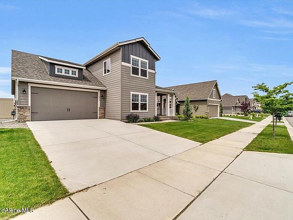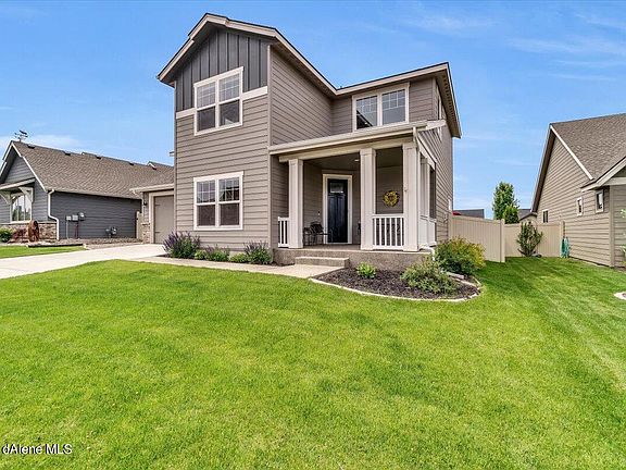 METICULOUSLY MAINTAINED NEWER HOME IN AN IDEAL CENTRAL COEUR D'ALENE LOCATION. This lovely home in the sought-after Trails neighborhood has 4 bedroom, 2.5 bath AND large flex room upstairs which could be a 2nd living room, media/craft room or 5th bedroom. The backyard is giant like a soccer field and truly is a blank slate with lush grass from one fenced edge to the other, ready for you to implement your inspired landscape design. The 4-car tandem garage is another treat giving you extra space for storage, a workshop, 4 cars or whatever your heart desires. Enjoy your morning coffee or an afterhours glass of wine on the spacious front porch, one of the largest in the neighborhood, or venture out to the back patio and watch the kids play. The home has lots of upgrades with LVP flooring, tall doors, stone gas fireplace, quartz countertops, full tile backsplash, Frigidaire Professional Series stainless steel appliances, large picture window in the living room, vaulted ceilings in master bedroom, and master bath has 2 sinks with a separate tub and shower. Washer, dryer, refrigerator stays with the home. COEUR D'ALENE SCHOOLS! Move in ready. Must see to appreciate.