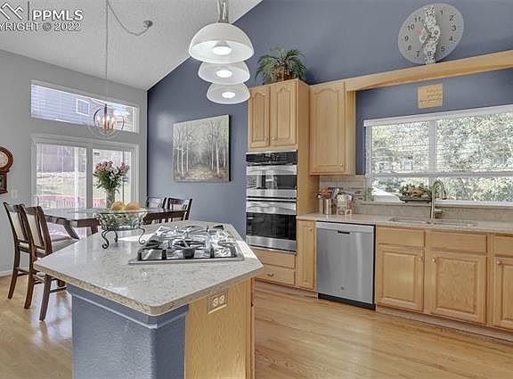 Rare find in Stetson Hills! Not only does this home have an attached 2 car garage it also boasts a detached 3 car garage! This is an incredible opportunity to own a ranch floor plan home on the East side of Colorado Springs with 5 garage spaces. Located on a cul-de-sac this home features vaulted ceilings, wood floors on the main, new carpet on the main, a separate office in addition to four bedrooms, gas fireplace, skylights and a large finished basement. The updated kitchen includes quartz counters, stainless appliances (including a convection microwave and gas range) and an island. The spacious and private backyard includes a large deck, privacy fence and water feature. Additional upgrades and improvements include a new driveway, covered front porch and the impressive detached garage/workshop includes two 220 volt outlets, multiple 110 outlets, dual garage door openers, work bench, cabinets, recessed lights, multiple air hose connectors and the garage is insulated, drywalled and painted on the interior. This truly is a rare opportunity - come take a look!