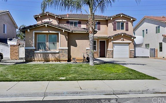 Large family home in the heart of Eastvale featuring 5 bedrooms plus a loft area and 3 full baths. Nice open, flowing floor plan with a full bedroom and bath downstairs for guests or an in-law suite. Downstairs offers a cozy family room w/fireplace just off the kitchen for easy entertaining and also a formal dining room and separate formal living room or bonus room or whatever you need it for. Kitchen has plenty of cabinets and counter space with a center island, a built-in double oven and granite tile countertops. Upstairs boasts 3 good-sized bedrooms, a nice open loft space or game room area, and the spacious master suite. Master bath is huge and offers a tranquil soaking tub, a large walk-in shower, double sink vanity and the perfect walk-in closet with plenty of room for all your clothes and shoes. Back yard is equipped with a solid covered patio cover with walnut finished ceiling and recessed lighting, ceiling fan ready and perfect for outdoor entertaining and family BBQs. 3-Car attached garages, massive RV parking with dump station behind the wrought iron gate. 10' X 12' Tuff Shed included. Recently installed whole-house fan w/digital timer, newer A/C units. Low tax rate and no HOA! Conveniently located close to shopping, entertainment and great schools! Come make your memories in this beautiful home!