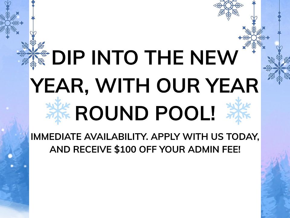 - Special offer! Dip Into The New Year, With Our Year Round Pool! Immediate availability. Apply with us today, and receive $100 off your admin fee!Expires January 13, 2026