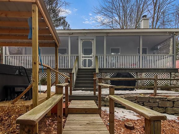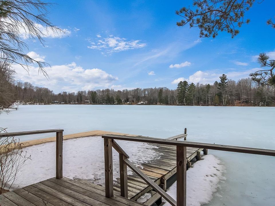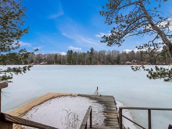 This splendid property boasts a tranquil, beautiful setting atop a bluff with 60' of private frontage on Perch Lake in Boardman Township. The charming 4 bed, 2 bath, 1,800 sq. ft. home is accompanied by a spacious and airy screened-in porch, multi-level decking leading to the water with a hot tub and paver-patio fire pit, and a wood platform which sits directly on top of Perch Lake. There is a refrigerator hookup by the fire pit and an outdoor shower by the lake. A nice porch with Trex decking adjoins the entry of the home, where the gentle sound of the wind in the tall pines provides a serene environment. A tiled entryway has two bedrooms off of the southeast wing of the home, the first of which is non-conforming and could be used as an office. The living and dining areas are open and spacious, featuring a cathedral ceiling and a stately stone-framed natural fireplace. The kitchen sits angled between the living area and the northeast wing of the house, which houses the master suite, an additional full bath, and the fourth bedroom. The master suite contains a bedroom with views of the late, a walk-through vanity and full tub, a large walk-in closet, and a separate water closet. A delightful boardwalk winds all the way around the exterior of the home, off of which the cavernous crawl space is accessed. The crawl space has roughly five feet of clearance, is insulated, and has a good layer of pea gravel on the ground. There is a garden shed/workshop on the long entry to the home. This gorgeous property has a lot to offer. Come and see this peaceful oasis for yourself!
