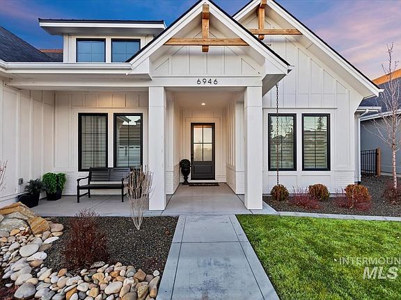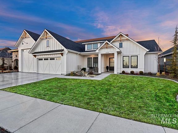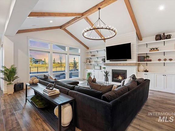 Stunning single-level Modern Farmhouse in Eagle's most coveted Legacy community! Welcomed by a tranquil rock water feature, this immaculate split-bedroom design w/Office LIVES LIKE-NEW & boasts chic custom finishes. Dramatic great room concept with cathedral ceiling & rustic wood stained beams. Wide-plank floors & Restoration Hardware light fixtures add warmth to the bright interior. Chef inspired gourmet kitchen w/quartz counters, commercial grade built-in refrigerator, THOR 6-burner gas range w/griddle, dual ovens, pot filler faucet, & designer hood. Primary suite is complete with a spa-like bathroom retreat featuring a fully tiled walk-in shower, dual vanities, backlit makeup vanity, free-standing tub, walk-in closet w/walk thru to laundry. Surround Sound & Hunter Douglas window coverings throughout. NO BACKYARD NEIGHBORS & VIEWS to the East. 46’ RV BAY GARAGE w/fully epoxied floors, custom built-in cabinets, & electric car charger. 3 Community Pools, Golf, Tennis, Playgrounds, and More! VIEW VIRTUAL TOUR