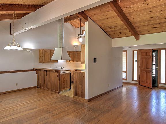 Relax on your back deck while watching the deer wander by! Three Bedroom, 2 bath single level home on .65 acre lot adjoining to common area on two sides. Home features vaulted ceilings, red oak hardwood floors and solid wood doors. New carpet in master and one bedroom; third bedroom has hardwood floor. Master suite has access to large hot tub located on back covered deck. Master bath has been renovated and has heated tile floors. Several closets have built-ins. Mud room between laundry room and garage provides extra storage space. Double car garage has built-in work bench. Spacious yard has underground sprinklers; backyard is fenced for your furry family members. Two outbuildings including one that is carpeted and heated. Lots of parking, including RV, and has RV clean out.