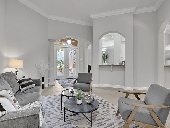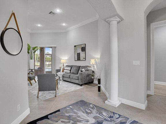 Set in the prestigious estate section of Parkland Isles, this stunning home offers impressive curb appeal and magnificent water views. Inside, you'll find tray and volume ceilings, crown molding, and recessed lighting throughout. Light, neutral tile extends across the foyer, living room, dining room, kitchen, family room, utility room, and fourth bedroom. The gourmet kitchen features elegant cabinetry, granite counters, a breakfast bar, and a walk-in pantry. The 3-way split bedroom layout ensures privacy, with the master suite boasting custom closets, a sitting area, and water views. The master bath includes a double vanity, whirlpool tub, and separate shower. Accordion shutters, impact doors, and a large paver driveway and patio complement the fenced pool area.