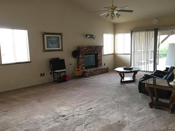 Desert oasis featuring, 3 bedroom 2 bathroom 1505 sq ft home is in a great location close to shopping and restaurants. Spacious open floor plan features, large kitchen with tile flooring, oak cabinetry, vaulted ceilings in the living room, brick fireplace, ceiling fans, 2 inch faux wood mini blinds, double door entry to vaulted ceilings in the master bedroom with a huge walk in closet, large master bathroom tile floors, garden tub and walk in shower, insulated garage door with opener, cabinetry in garage, desert landscaping in front and rear yard, covered patio in rear, R.V. area, fully fenced, over sized concrete driveway and mature trees. Nestled in a quiet cul-de-sac with a great view of the desert and mountains. Agent Remarks: Please give 2 hour notice for showings. Call listing agent for appointment. 702-557-4365, 760-373-8282.