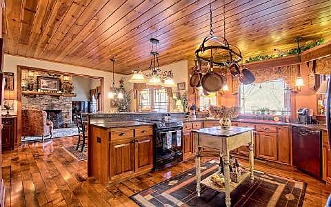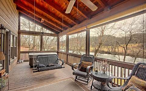 An Elegant Country feel best describes this Immaculately maintained Hiawassee Riverfront Home. Nestled on a Picturesque Tree lined lot and just steps from the home to the river. Open floor plan, nice kitchen w/ granite countertops, nice appliances, custom cabinetry, dining room, living room with Tennessee stack stone wood burning FP, gorgeous distressed hickory floors, French doors leading out to the full length cov'd porch. Spacious Master on main, jetted tub, double vanities, tile shower. Huge Laundry room on main & large office. Relax & enjoy fishing for native rainbow trout or just listen to the sounds of nature. Outside fire pit, Private well, paved drive, 2-car garage, 500 gal. buried propane tank & tons of storage. A must see !!!!