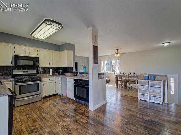 Welcome Home!! This beautiful home offers a spacious 14x23 master bedroom with private access to the upstairs bathroom. The truly custom one of a kind floors that will take your breath away pair amazingly with custom country cabinets to bring the kitchen to life! Cooking is made easy with double ovens. Amazing views of Pikes Peak from the deck that leads out of the kitchen. On the lower level there is 3 additional large bedrooms and bathroom along with a large second living room. This home is paired with a huge backyard with plenty of room for kids to play and BBQ. There is a beautiful fire pit to enjoy summer evenings on a back patio that runs the length of the home. This wonderful home has been taken care of to the last detail! New Interior Paint, New Exterior Paint, New Irrigation System, Custom Hardwood floors, New Deck. ALL WITHIN THE LAST 30 DAYS!!!