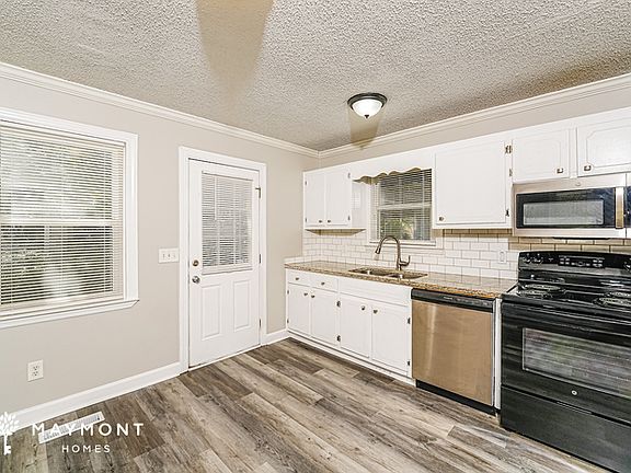 Step inside to find a cozy living room featuring LVP floors and windows that bring in plenty of natural light. The bright kitchen is designed with white cabinets, a window over the sink, a subway tile backsplash, and matching stainless steel appliances, all set on durable LVP floors.