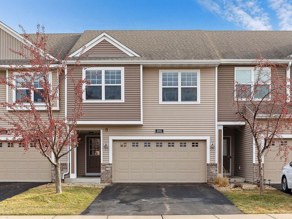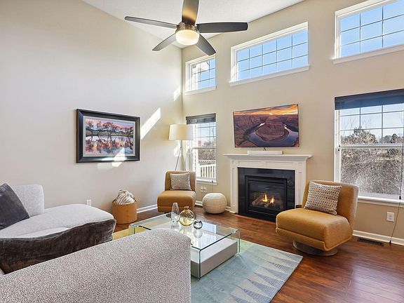 This chic townhome comes to you move-in ready, super easy to care for, and loaded with updates. You have to be here to fully appreciate the soaring ceilings in the main living area, new wood-inspired plank flooring, & wall of SE-facing windows surrounding the gas fireplace creating a warm ambiance. Enjoy meal time in a kitchen with quartz countertops, an island, & stainless steel appliances (fridge 2 yrs old & dishwasher only 3 yrs). Upstairs the carpets have been freshly cleaned & you'll find two generously-sized bedrooms along with a full-sized stacked w/d in the hall closet. The primary suite includes a walk-in closet and en suite full bath just for you. The utility room in the fully finished walkout lower level houses a brand-new H2O heater & softener. Get some fresh air by walking out to the patio on the LL or the deck upstairs upgraded recently with Trex to ensure low maintenance & longevity. See a full list of updates in supplements. Short walk to schools, parks & trails.