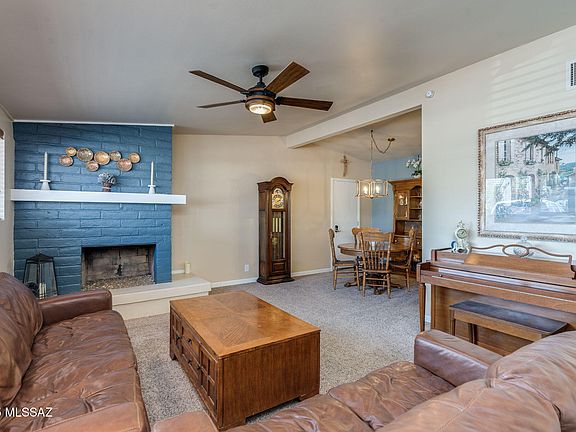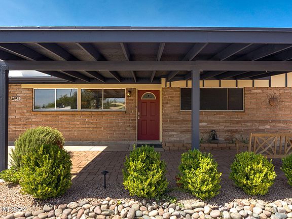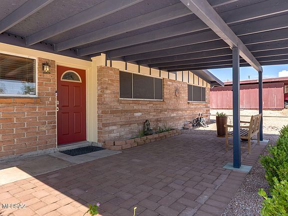 Welcome to a charming mid-century home at 6951 E Hayne Place! Located on a quiet cul-de-sac in Tucson's east side, this 3-bedroom, 1-bath brick home offers a thoughtfully updated living space. Enjoy a remodeled kitchen with granite countertops, decorative trendy backsplash, single stainless sink with attachments, a spacious living area with a cozy fireplace, and a renovated bath featuring a jetted tub and granite vanity. Fresh new exterior paint and neutral indoor paint, neutral carpet and tile, and central air ensure move-in readiness. The large backyard includes mature shade trees, a storage shed, and extra parking. Within walking distance to schools, and close to Park Place Mall and local eateries, this family-friendly property presents a blend of comfort and convenience.