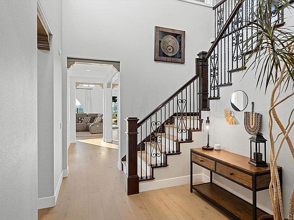 Step into a breath of fresh air as you take in this luxurious La Costa Greens treasure! Enter in through the gated courtyard, past the bubbling fountain and find yourself under soaring ceilings flanked with wood beams and uniquely gorgeous crown molding. An entire downstairs remodel in 2019 brought in exquisite European oak hardwood floors with upgraded baseboards leading to a wall of windows that show off sunset views over the Omni La Costa Resort and golf course. The light and bright gourmet kitchen boasts a large island & eat-in kitchen, quartz counters, stainless steel appliances, double ovens and an amazing butler's pantry/prep kitchen with sink and storage galore right off an additional dining area that overlooks yet another elegant courtyard with custom water feature! This four-bedroom, four full-bath home offers one bedroom and full bath downstairs. Upstairs, an airy loft is perfect for a play room, home gym or office. The master bedroom shows off the incredible views and the ensuite master bath, with separate vanities, features a large walk-in closet with custom organizers. One of the secondary bedrooms has a full attached bath, perfect for guests! The private backyard is beautifully finished for relaxation and entertaining with outdoor speakers and no neighbor behind you! Two AC units (one for each level) and dual-pane windows throughout are other bonuses. Goldstone Road is a highly sought-after cul-de-sac full of wonderful neighbors and is just a short walk to Jardin Park where you will find pickleball and tennis courts, a playground and space to picnic and run! Residents also have access to the "Presidio" which features a huge pool with cabanas, spa, gym, and clubhouse. La Costa Greens is close to shopping, wonderful restaurants & Alga Norte Park. Come see!