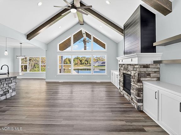 The Crown Jewel from Leffler Builders — this stunning home in Whitehouse Meadows blends sleek contemporary design with timeless craftsman style. Located near the Wabash Cannonball Trail, it showcases unmatched craftsmanship and attention to detail throughout. Step inside to a dramatic cathedral ceiling with hand-stained beams, pan ceilings with wood accents, and walls of windows framing breathtaking water views. The living area features a natural stone and shiplap fireplace, while the kitchen impresses with 10-foot ceilings, shaker cabinets with glass doors and backlighting, quartz countertops, a massive island with seating for eight, and black stainless smart appliances. The dining room offers full water views and access to an elevated covered patio with a wood plank ceiling—perfect for relaxing or entertaining. The primary suite was designed for tranquility, with serene views of woods and water, a spa-inspired bath with double vanity, oversized walk-in tile shower, separate soaking tub, and direct access to the laundry room. The lower level offers endless potential with full-size egress windows, ready to be finished for additional living space. Built with efficiency and quality in mind, this home includes a 5-star energy rating, tankless water system, Pella windows, and high-efficiency furnace. Exterior highlights include full irrigation and professional landscaping. Every finish reflects luxury—from the lighting and plumbing fixtures to the natural materials and craftsmanship. This is truly one of Leffler's finest builds—jaw-dropping from every angle and the pinnacle home in Whitehouse Meadows.