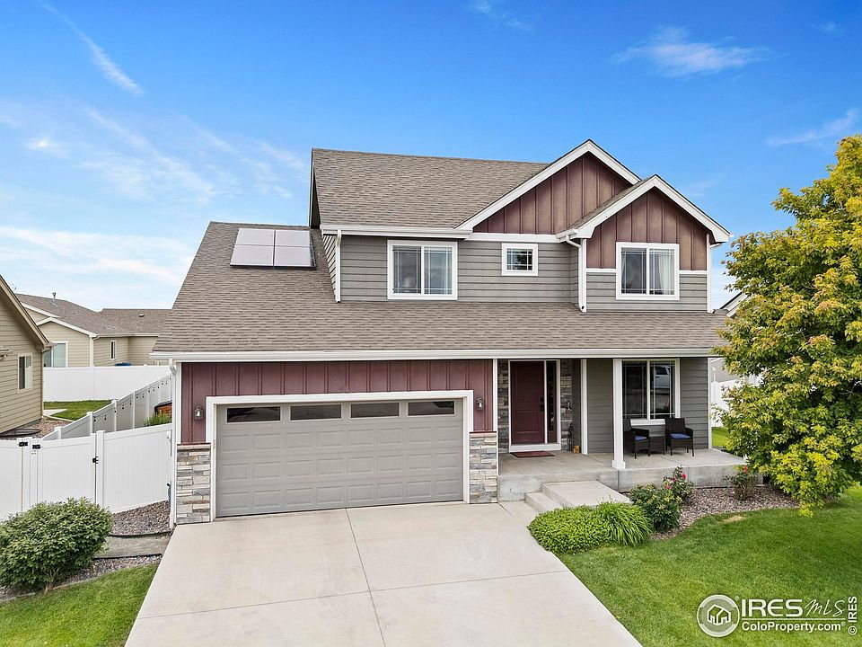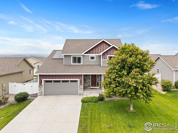 Welcome to this stunning 2-story, 3 bed, 4 bath Sage-built home in The Meadows. Nestled on a quiet street, this residence offers comfort, elegance, and modern upgrades throughout. Step inside through the keyless entry to find a bright main floor with beautiful wood floors throughout, featuring a powder bath, dedicated office, spacious living room with gas fireplace, and a gourmet kitchen with granite countertops, a large island, and stainless steel appliances. A separate dining room makes entertaining easy. The main floor primary suite includes a luxurious 5-piece bath and walk-in closet, with a convenient laundry room nearby. Upstairs, new carpet flows throughout, leading to a versatile loft and two light-filled bedrooms with a full bath. The unfinished basement with a complete 3/4 bath offers future expansion potential. Enjoy the beautifully landscaped front and back yards with perennial plants. The house features newer roof (2022), solar panels, an EV charger in the garage, and smart switches throughout the house with the lights changing color for modern living. With one of the largest floor plans in Wellington and a rare main-floor primary suite, this home is truly a standout.