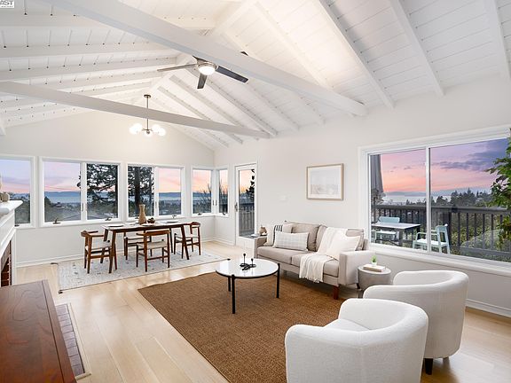 Located in the beautiful Oakland hills above Montclair Village and just minutes to highly ranked Thornhill Elementary School, this thoughtfully updated 2-story 1940 vintage home offers panoramic SF Bay, 3 bridges, wooded vistas and Oakland city views. This charming, light-filled home includes many period details complemented with modern details, and features 3 bedrooms, 2 remodeled bathrooms, an open living/dining room, an updated eat-in kitchen, and a 2-car detached garage. Wonderful outdoor spaces include a large, level garden, a lawn, patios, a spa and a raised wood deck off the home's LR/DR. The expansive, garden-level primary bedroom suite can be converted into an optional family room with built-in display shelves + entertainment center. Highlights include newly updated kitchen/bathrooms, a dramatic cathedral plank ceiling with exposed beams, a fireplace, fresh interior/exterior paint, new light fixtures, refinished oak floors, central AC and a newer roof. This is a vintage property complete with stunning views, attractive updates w/high-end finishes, and easy access to Berkeley, Rockridge and Elmwood dining and shopping. This home has it all!
