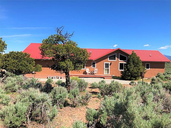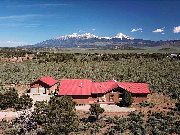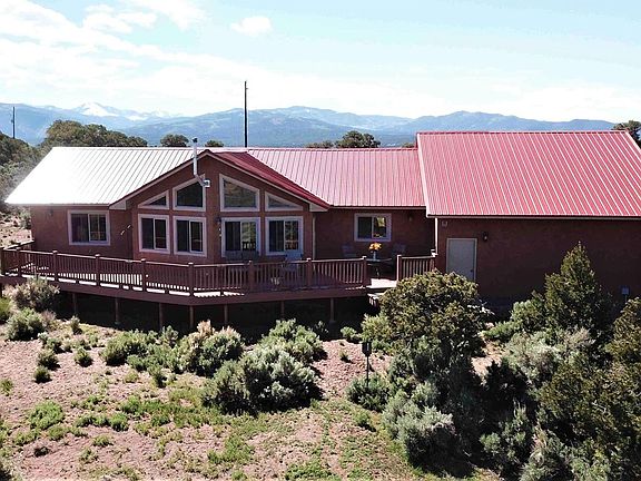 Immaculately maintained, one floor home with composite deck, metal roofs and breathtaking views of high, snow capped mountains. Dream kitchen with new appliances, natural stone counter tops, gas range, high end features and a wall of practical drawers. With 1339 sq ft of living space and 1392 sq ft of garage and workshop space on 5.15 acres, everybody will be happy! The large and open living room has picture windows with million dollar views of Blanca Peak, Mount Lindsey and Little Bear in the southern Rockies. The master bath has a beautiful claw foot tub. There is a circular driveway. 50 Amp electric and a second septic is installed. Located very close to paved road and only 2 minutes drive to Mountain Home Lake. With 2 bedrooms and 2 and 1/4 baths, this will the perfect mountain retreat for vacationing or full time living. The home looks and is as good as new! Fort Garland is only 5 minutes away. Some furniture will stay.