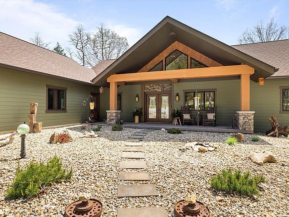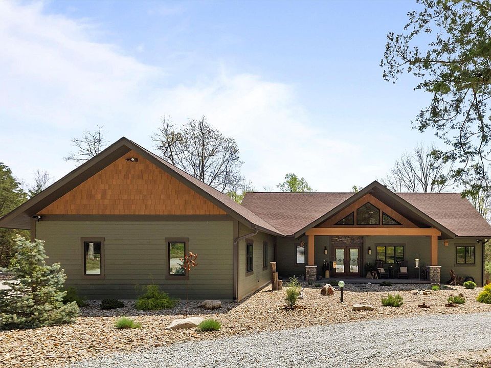 Welcome to your new private retreat! This custom Amish-built rustic home, meticulously crafted in a ranch-over-walkout basement design with 4 sliding doors and floor to ceiling windows invite the outside in. State-of-the-art materials provide for a maintenance free exquisite exterior of lasting beauty. Specifically, James Hardie fiber cement, TimberTech decking, and JAIN NuCedar PVC trim/shingles masterfully capturing the beauty of real wood. Boasting over 3,800 finished square feet of timeless craftsmanship, this luxury property blends a Colorado inspired design with charm and modern sophistication. A grand double-door entry welcomes you into a warm and inviting interior showcasing exposed beams, natural stone accents, and custom precision millwork. Beautiful solid hickory floors are found throughout the main level. A cozy stone gas fireplace with a raised hearth anchors the living area, creating a perfect setting for relaxation. At the heart of the home is a chef’s dream kitchen outfitted with top-of-the-line Thermador appliances, perfect for entertaining or everyday gourmet cooking. Discover the three generously sized bedrooms, each offering comfort and privacy, along with a dedicated home office that provides a quiet and inspiring workspace for remote work or study. The home features three full bathrooms, each adorned with high-end finishes and elegant design. Luxurious tile flooring and striking one-of-a-kind granite surfaces provide a refined aesthetic. The lower level family room features a wet bar and a large secondary living space. Also found on the lower level is a wine room/storage room that could have the partition wall removed and an egress window added for use as a bonus room or 4th bedroom. Enjoy the serenity of nature with a wrap-around deck offering scenic views of the secluded woods. The backyard includes a covered patio ideal for hosting gatherings or unwinding, complete with a firepit and a hot tub for year-round enjoyment. The generous 3-car garage provides ample space for vehicles and storage. From its thoughtfully designed layout to the abundance of premium features, this property offers an unparalleled living experience in one of Bloomington’s most desirable locations.