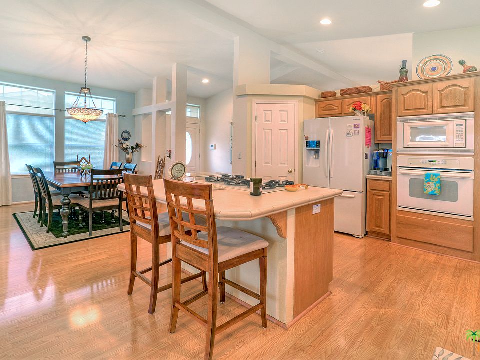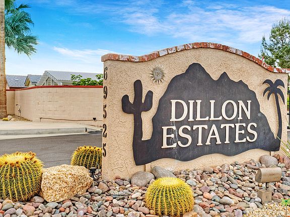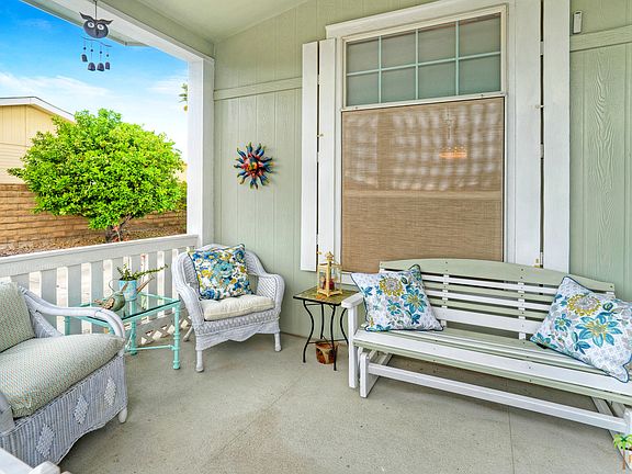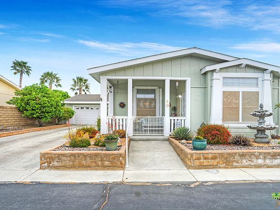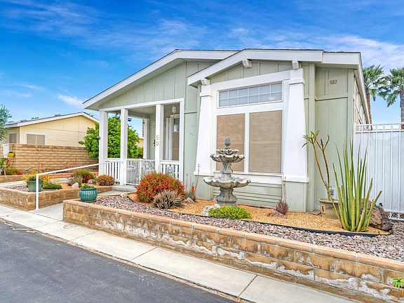 This beautiful home catches your attention at first glance! Immaculate exterior with a darling covered front porch with seating to gaze over the San Jacinto mt. range while sipping your morning coffee or afternoon beverage. The interior is as charming as the exterior and in mint condition, with an open floor plan perfect for easy living all centered around a large kitchen adorned with newer appliances and a large island with seating. It's a cook's kitchen with ample storage, pantry and built in desk area next to the breakfast room. Step right out of the Kitchen and into a huge dining room, formal Living Rm or your cozy TV/Den room. Down the hall you will find 2 bedrooms/baths with good storage and a laundry room/craft room. The oversized garage has plenty of extra storage and a surprise office area off the back of the garage that opens to a private patio hideaway for relaxing! The community has an active clubhouse and features a large pool and 2 large spas fed by DHS mineral waters!