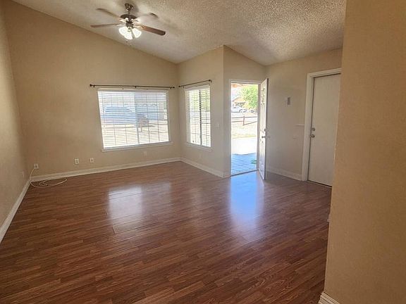 This is a 2 bedroom, 1 bath home with a 2 car attached garage, offering 868 square feet. Home has a nice kitchen, vaulted ceilings, offers tile & wood flooring throughout. Amenities include fridge, built in microwave and gas range. There is a window A/C in one of the bedrooms and the rest of the home is cooled by swamp cooler. Backyard is fully fenced.Pets at owners discretion! 1 year lease required! Contact us today for a private showing. $40 application fee. Offered by Coldwell Banker Roadrunner Realty. Lic.# 01517134