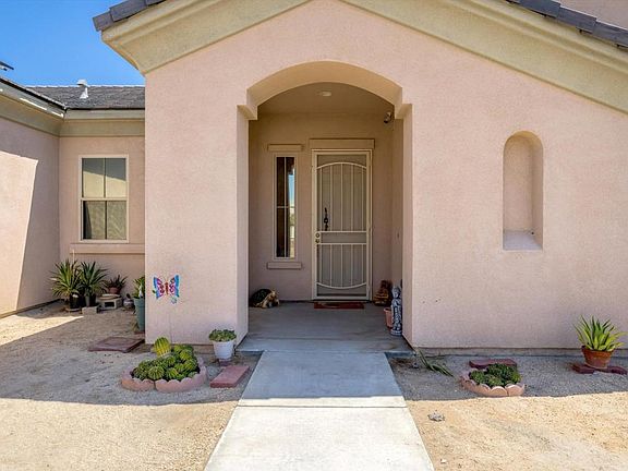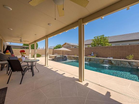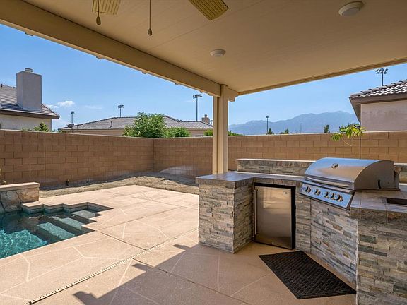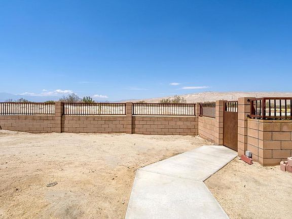 The front of the home has an enclosed yard with views of the San Jacinto and San Bernardino mountains.Just inside and you will see where you will see your dining room. To the right is the third guest bathroom and bedroom. Open living room with built-in gas fireplace. Kitchen has a breakfast bar, Baltic Brown Granite countertops, Whirlpool appliances and a Frigidaire Dutch Door refrigerator. Culligan fresh water tap at the sink, Large corner pantry. Through the sliding glass doors is a Barbecue Island, Wine Chiller, and sink, and covered patio with built-in lighting, and ceiling fans. The custom pool has a tanning ledge, waterfall features, spa, and colorful sea turtles against a blue background. Blue crystal gas fire pit behind the spa. The Patio also leads to Main Bedroom and Bath with Large walk-in closet, Bathroom has individual Vanity sinks, deep soaking tub, a shower and a water closet. Down the hall the second guest bath with dual sinks and shower and the second bedroom, laundry room and two-car garage. Let's talk about the other upgrades. There are two banks of Solar Panels (One owned and one leased) along with a Battery Backup system to keep your food cold, your main bedroom and living room lighted and your garage door opener useable during a power outage. There is a whole house water softener system in the garage. A Ring camera and several cameras protect your privacy. All this, close to a park, close to the freeway and NO HOA! It's time to make your move.