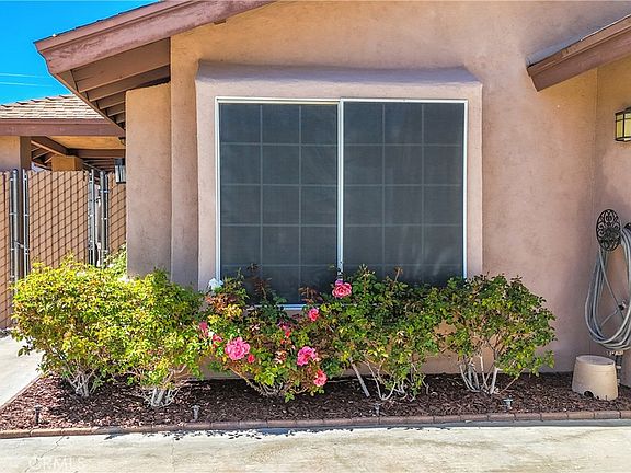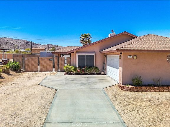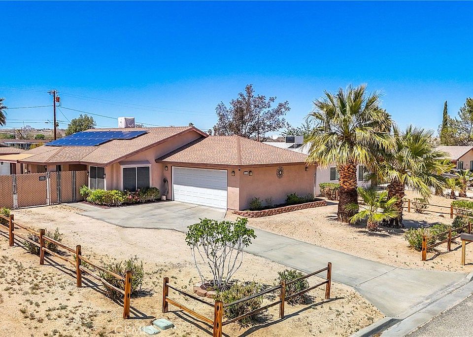 This ENERGY EFFICIENT home is truly a fantastic gem in a quiet 29 Palms neighborhood. PAID OFF SOLAR system reduces total utility costs to an average of less than $90/month for electricity, natural gas, and water. Oversized HVAC system keeps you super cool during the summer and warm during the winter months. Seller will contribute up to $5000 towards closing costs or down payment, or alternatively, use it to buy down your interest rate. Meticulously remodeled kitchen boasting self-closing cabinets, quartz countertops, custom backsplash, and a built in Waterdrop reverse osmosis drinking water system. Both bathrooms have been elegantly remodeled and tile flooring throughout the house. Natural light pours in through the beautiful bay windows, illuminating the spacious interiors with neutral paint colors. The generously sized bedrooms feature ample closet space. Outside, chain link fence with privacy screen around the entire backyard and a low-maintenance watering system for the beautiful roses and desert shrubs. Expansive wraparound porch invites you to unwind and soak in the views of the mountains and gorgeous sunsets. The attached 2-car garage has an EV charger outlet — plus a separate detached 2-car garage/workshop in the backyard offers additional versatility. Kitchen appliances plus refrigerator and Maytag washer and dryer conveys with the house. Convenient location just over an hour from Palm Springs, mere minutes from the entrance to Joshua Tree National Park and Marine Base. Don't miss your chance to make this desert gem your own paradise. Schedule your viewing today!