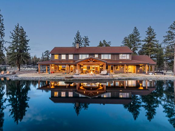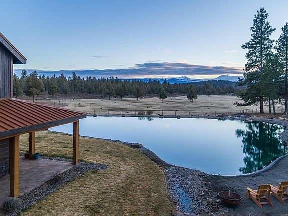 This stunning private ranch offers 79.48 scenic acres with panoramic Cascade Mountain views, a pasture, and a stocked pond in a wooded setting. The NW-style home, designed by Steele & Associates, opens to a vaulted great room with exposed beams and a double-sided wood burning floor-to-ceiling fireplace. In the gourmet kitchen, a large granite island complements Thermador panel-ready appliances, a wine fridge, and hammered copper farmhouse sinks. The main-level master suite offers mountain views, a hammered copper soaking tub, radiant floor heat, and access to a 20' swim spa. A guest room with en suite, two additional bedrooms, and a bonus room complete the second floor. Outside, enjoy the seasons on a large patio with fire ring. Additional features include a 3-car insulated garage and a 4-stall barn with tack room and RV center aisle with hookups. The fenced property, only 6 miles to the community of Sisters, is backed by 160 acres of BLM land and includes 7.5 acres of irrigation.