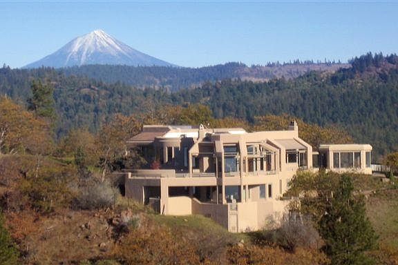 Skyhouse So. Oregon, is tucked into the top of Roxy Ann Ridge with 360° views from the Cascades across the Valley to the Coast range. Mixed modern architecture creates a traditional NWXSW look and warm ambiance. Privacy and tranquility in a spectacular rural setting. Skyhouse combines luxury with the warmth of a family home. The living area is designed around an intimate space facing the fireplace – that expands for large families and social events. The home's multiple levels are served by helical ramps and gentle stairs, reminiscent of Frank Lloyd Wright. Priced at $1,990,000.00 on ten acres; and, at $2,900,000.00 on 123 acres