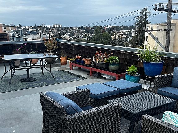 Monthly loan payment is $1,450, 5% fixed rate interest available!! Modern large one bedroom condo in trendy Cleveland Heights superb location by Lake Merritt and Lakeshore/Grand Ave. shops, TJ's, Peet's, (5 min walk) Bus to BART & SF across the street, etc. Walk score 86. Pergo real wood flooring in living room/ dining room about 24ft. long with at least 9' ceiling and crown moldings, built in shelving, large closets. Sliding glass doors from living room lead to balcony with nice views and peek of the Bay, place to sit and relax and watch Sunset. Quiet with no common walls with neighbors in bedroom and elevator access to this 3rd floor condo. Recessed LED lighting, new dishwasher, disposal, glass top stove and granite counters, This is a very friendly quiet condominium building with no smoking. Pets permitted by condo HOA. Easy street parking and gated garage deeded parking spot. Lovely roof deck with outdoor seating and great cityscape views. Owner is a licensed real estate broker. Will cooperate with buyers agent if they have one