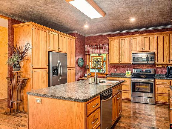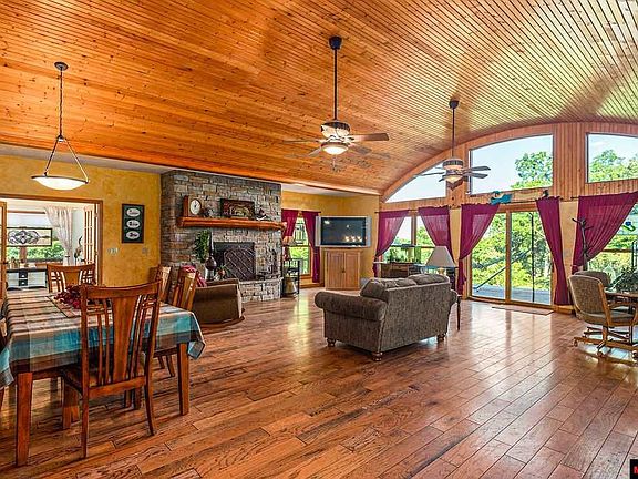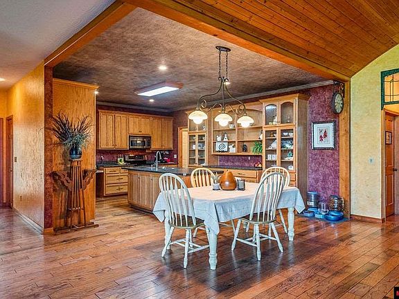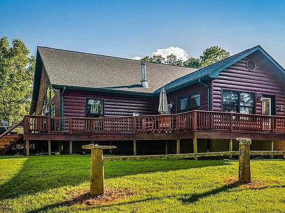 Welcome home! Inviting entry opens to great room with stone fireplace and unique raised barrel ceiling. 3 BR w/2 full baths plus a bright sunroom with access to lg lower level. Laundry is off the spacious custom cabinet kitchen w/SS appliances & island. You'll enjoy the amazing sunrise/sunset views from your wrap around deck and explore the wooded 51 ac m/l complete w/horse barn and fenced corral. 60 x 80 pole barn and 2nd pole barn. Guest house too. The ponds, creek and lake view make this the perfect home