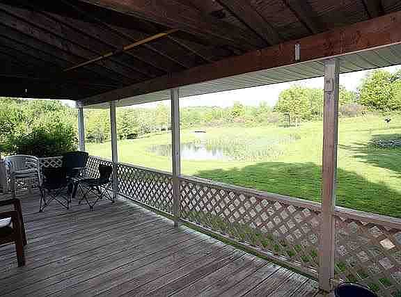 This spacious country home is perfect for family and friends -- and horses! It sits on 5 acres -- level and mostly cleared -- with a stream and a lovely pond. This is a horse property with fenced fields, a riding ring (needs grooming), and a 4-stall barn with tack room and wash area. The house encompasses 2,434 square feet with 7 bedrooms, living room, eat-in kitchen, dining, den and offices. Master bedroom has large jacuzzi tub. Basement is full and opens to a garage at one end. Garage area can handle 2 cars. The large covered deck faces out to the barn, fields and pond; you can relax in the sheltered space and view almost the entire property.