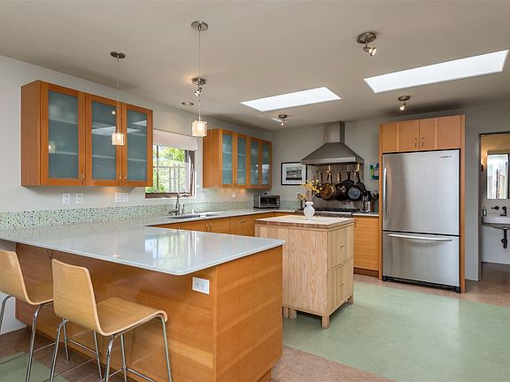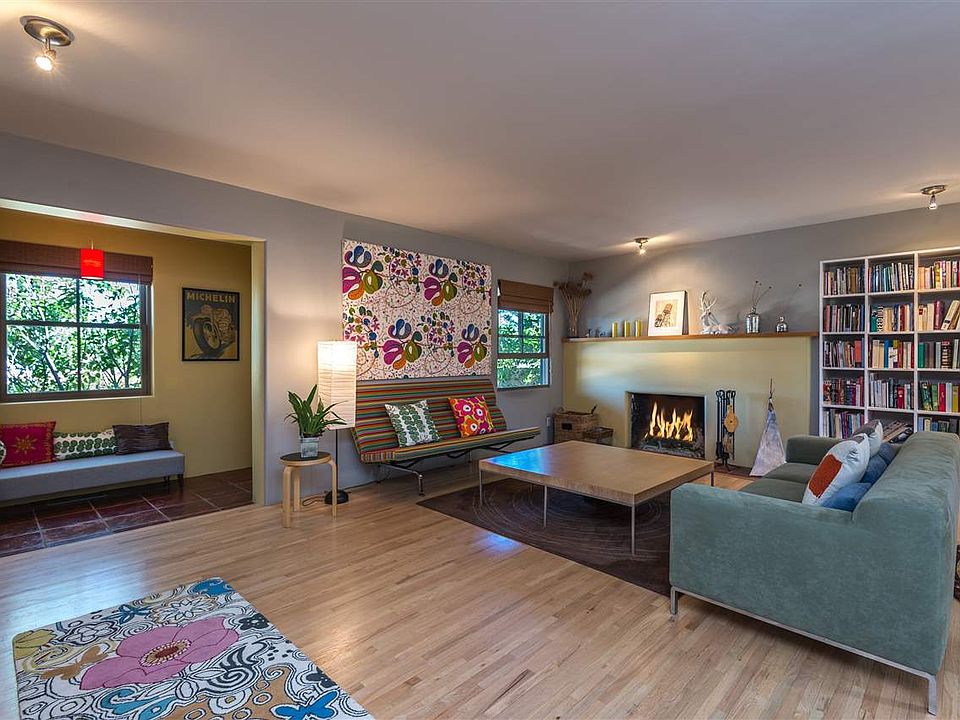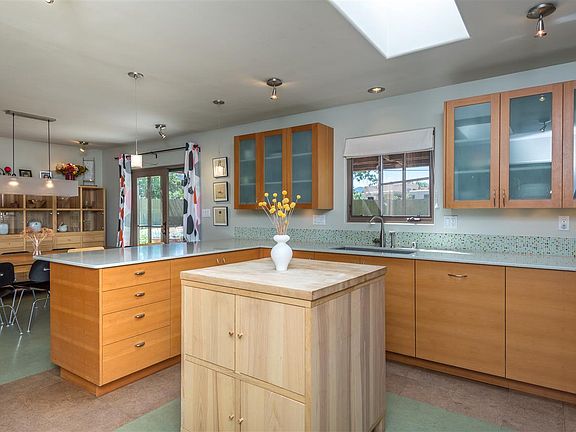 This quiet, contemporary, turnkey 3 bedroom, 3 bath home offers a sequence of open, stylish, easy to live in spaces with high end features. The kitchen is bright and airy, with custom glass door cabinets, sleek stainless steel appliances, Wolf gas range and cork floors. A tiled entryway feeds into a graceful living room with fireplace and wood floors. The master has plenty of closet space, with a large walk-in closet and an additional smaller closet, both with built ins. Master bath is outfitted with elegant European fixtures. A large family/play room features a built in desk and large wall of custom shelving and storage cabinets to keep things organized. Specialized lighting, skylights, and ceiling fans run throughout the house, plus all closets contain built in, high end shelving. A sizable evaporative cooler keeps the house comfortably cool in warmer months while a high efficiency furnace keeps it toasty in winter. A large, fully fenced backyard with shaded portal offers plenty of room for entertaining. In front, a walled rose and thyme garden with covered portal adds privacy, while the paved driveway accommodates several spaces of off-street parking as well as a dedicated covered parking area for two vehicles.