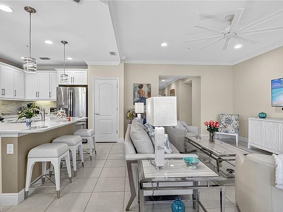 This stunning coach home offers sparkling water and fountain views in the highly sought-after community of Avalon of Naples. Ideally located across from guest parking for added convenience, this residence combines elegance, comfort, and modern upgrades throughout. Built in 2018, the open-concept floor plan spans 1,467 square feet and includes a one-car attached garage. The interior is light, bright, and immaculately maintained, featuring porcelain tile flooring throughout (no carpet), stainless steel appliances, quartz countertops with a glass backsplash, an expansive kitchen island, impact-rated windows and doors, 9-foot ceilings with crown molding, upgraded lighting, and a smart home package with smart lock and thermostat. The spacious primary suite boasts a massive walk-in closet, a large walk-in shower, and dual vanities. A wide screened lanai with roll-up sunshades, newly installed tile and upgraded ventilation fans provides the perfect spot to relax while enjoying tranquil views. Avalon of Naples offers a community clubhouse, resort-style pool and spa, and gated security, all just minutes from downtown Naples, world-class dining, shopping, and the white sandy beaches.