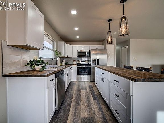 This beautifully remodeled home is located in Country Club Heights on a large lot close to schools, shopping and easy access to I-25. The upper level features an open layout with a spacious living room, dining area, and stunning kitchen that boasts new cabinets, butcher block countertops and tile backsplash with a large island and new ss appliances! The upper level also has an owners suite with an attached bath and two additional bedrooms and another full bath! The lower level features an enormous family room with plenty of room for a gaming section and family room with a gorgeous black brick wall fireplace! The lower level also is finished to include two huge bedrooms and another bath! The luxury vinyl flooring is throughout the foyer, living room, dining room, kitchen, hallways and bathrooms! Additional features include new exterior and interior paint, new lighting throughout, new carpet, an oversized 2 car garage, large concrete patio, fenced in back yard and so much more!