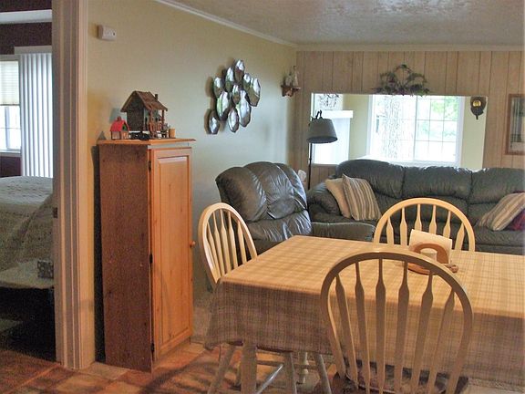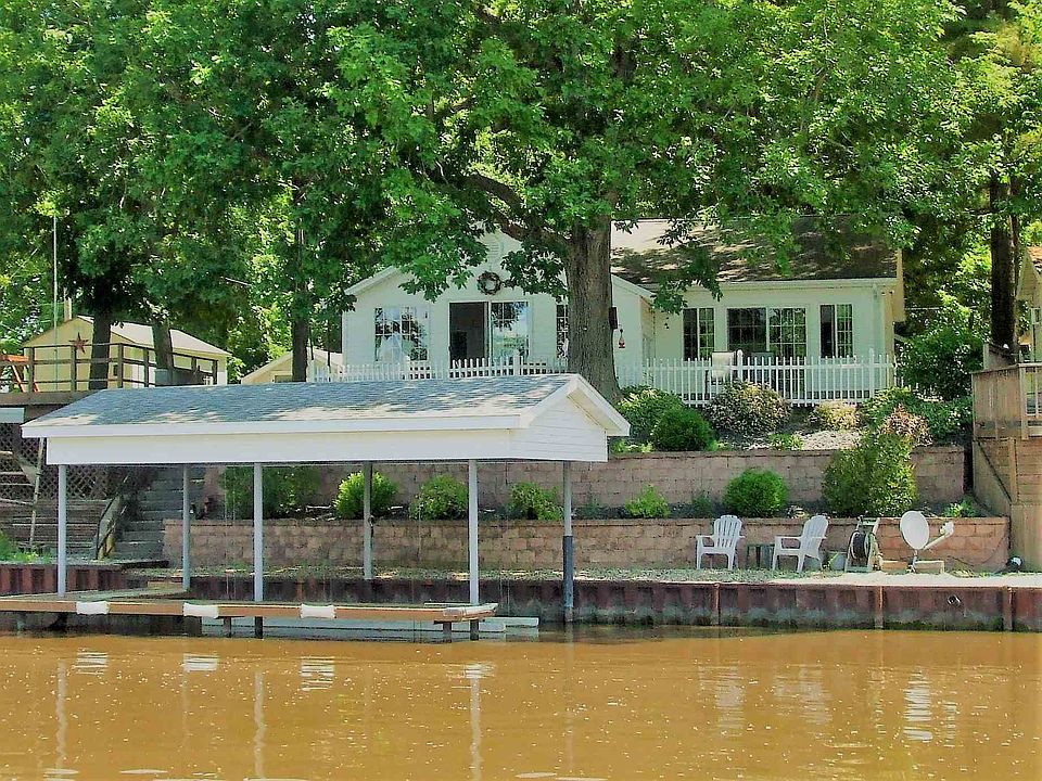 Very well maintained 3 Bedroom 2 bath 3 (THREE) Season Home. Many upgrades. In 2007/08: Master bedroom and bath were added plus new windows, & expanded lakeside deck. This Lake front home has a permanent boat lift and piers, nice concrete stairs to the water. Fantastic panoramic view from deck outside, master bedroom or den inside. There is a 1 car garage that is NOT insulated and the well pump and pressure are located in the garage. Garage has 2 sheds attached. Lots of storage and enough parking for at least 6 vehicles or more. Most of the furniture will stay.