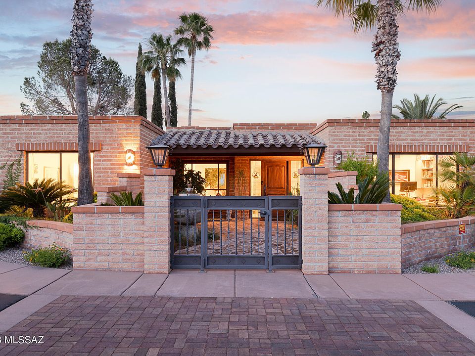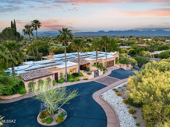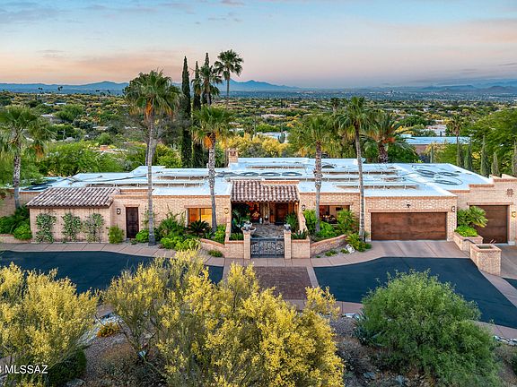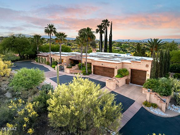 Perched atop a gentle hillside in Catalina Foothills Estates No. 9, this Territorial Style gem is graced with epic sunsets, views of the city, solace, and relaxation - just as its namesake Solaz would suggest. With 3,717 Sq Ft and 4 bedrooms & 3 bathrooms, the single level, split floor plan offers generous space yet private comfort & luxury. Sitting clandestinely on over one acre in the Catalina Foothills, the panoramic views of the city and sunset envelop the outdoor spaces. The well-manicured private backyard is surrounded by serene desert landscape & features resort-style amenities that provide perfect relaxation & entertainment options: solar heated pool & spa, putting green, built-in BBQ, private patios & dining space under the large, covered patio. The primary suite is positioned with direct access to a private patio and is its own large retreat with over 250 Sq Ft of space and a spa-like ensuite primary bathroom and large walk-in closet. Attached to the primary suite, is a versatile space that could be an exercise room, office or converted to a large 2nd closet.