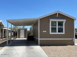Newer mobile in this beautiful 55+ community has been further upgraded—come see one of the nicest units in the neighborhood today!! Custom built oversized storage shed with electric is just one of many fantastic perks! Brand new luxury vinyl plank flooring in all the right places, brand new carpeting in all 3 bedrooms! Stainless steel appliances compliment a gorgeous kitchen with upgraded tile backsplash. Washer and dryer also included in this sale! Brand new custom 12x23 outdoor paver patio with pergola and double-sided fireplace great for entertaining and enjoying beautiful AZ sunsets! Buyer must qualify with community to purchase, please submit application with community when sending offer!