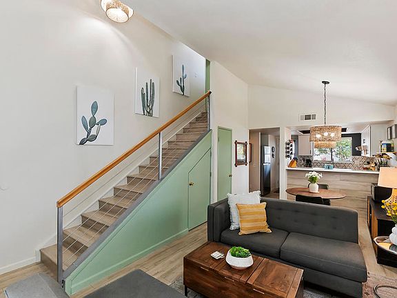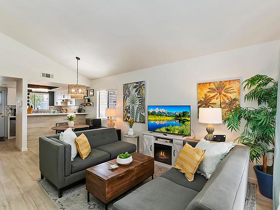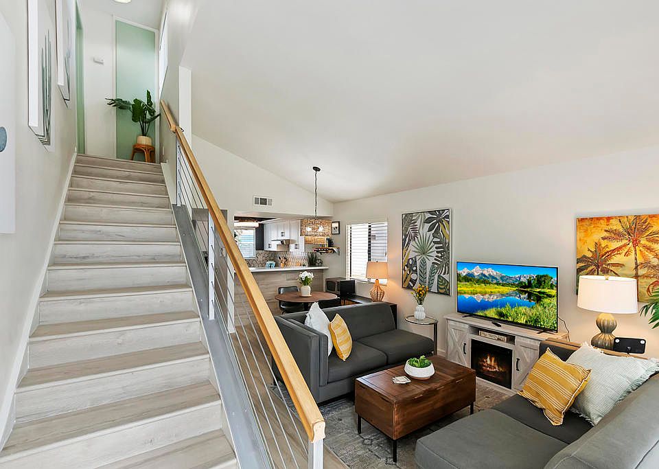 Just remodeled completely FURNISHED end unit. New kitchen with quartz countertops and bar, new 5 burner gas stove and vent, new backsplash and lighting all ceiling popcorn removed and entire interior painted. New wood laminate (waterproof) flooring throughout. New custom modern stair rail, New tub/shower and vanity downstairs, new large custom shower in master with dual shower heads and new gold color fixtures. Balcony upstairs plus front courtyard and nice sized back patio area that leads to a 2-car garage. Short distance to pool and clubhouse, HOA recently painted all exteriors, new roofing and re-paved all streets.