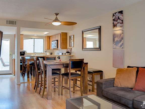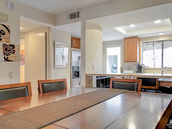 This highly sought after, 3 bedroom, 2 bath home is centrally located in the gated community of Rancho Mirage Resort. Featuring updated flooring & kitchen appliances, smooth surface ceilings, can lighting, built-in desk and storage and 2 walk-in closets. The newer 5-ton A/C unit, ceiling fans and whole house ventilation fan that draws cool air upstairs almost instantly help to keep cooling costs down. Convenient, attached 2-car garage with shelving has plenty of storage space. Enjoy the views of the greenbelt from your front patio or private balcony or relax in your secluded, south-facing, private courtyard. Spend your leisure time at one of the 2 community pools, 3 spas and 3 tennis courts. Host your next event at one of the 2 clubhouses. All this with low HOA's and fee land (you own it)! This place has it all, including a Rancho Mirage zip code!