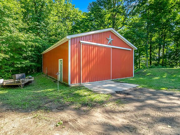 Welcome to this custom-built ranch home sitting on 14 wooded acres with a 30x40 pole barn. Pole barn has concrete floors and 12 ft ceilings. You will appreciate the long driveway to this peaceful paradise. This meticulously cared-for home has an inviting open floor plan. As you enter, you'll be greeted by a spacious living room featuring a gas fireplace, high ceilings, and an abundance of natural light. The living room seamlessly flows into the eat-in kitchen, which offers ample storage space, tons of cabinets/countertop space, an island, and much more. All appliances stay with the home. This home features 2 bedrooms (with the possibility of 3), 2 bathrooms, a fully finished walkout basement, main floor laundry, and 2880 sq ft. The primary bedroom has two walk-in closets. Enjoy a cup of coffee on your covered porch. Partially fenced back yard with a doggie door. There are two doors at one end of the home. One door is meant to go into the garage, that was never added. However, siding is in the barn (that matches the house) for the garage if you decide to build one. Not far from Hillsdale, Hudson, and Pioneer Ohio. Call me today for your own private viewing.