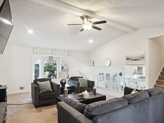 Step outside to enjoy the front yard and backyard, which boast ample shade from the surrounding trees. You can even gather around a campfire for a cozy evening experience. The flooring throughout the house is carpeted, providing a cozy and comfortable feel. The open-plan kitchen is equipped with an oven, a refrigerator-freezer, and an island with four barstools. For additional storage, there is a freezer available in the garage. Parking is a breeze, with designated spots in the one care garage and driveway. The garage features a door that opens for easy access.
