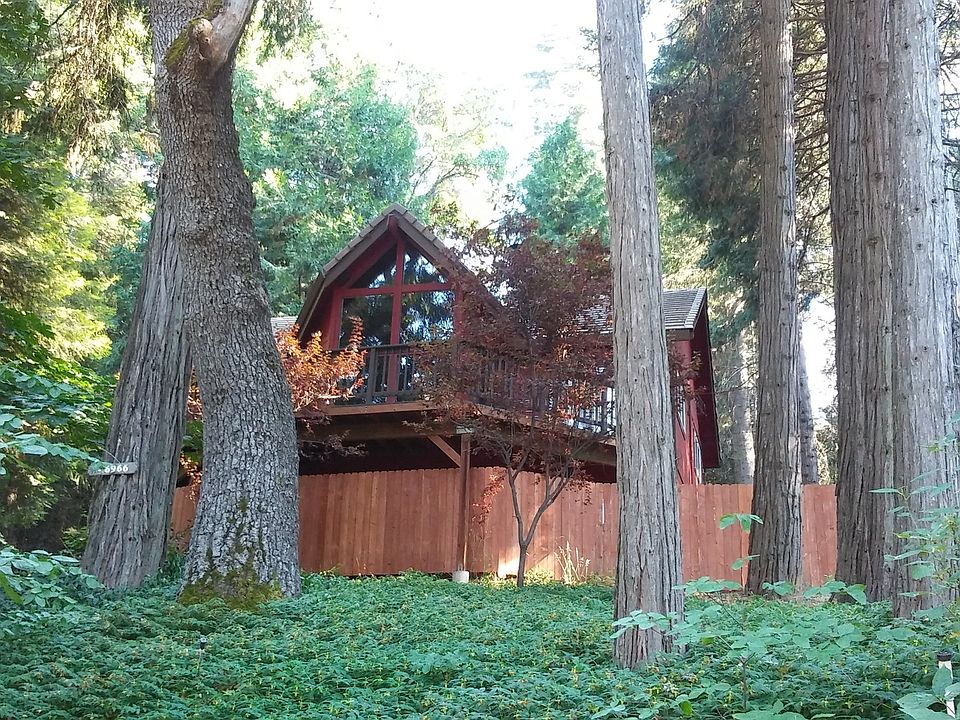 Chalet-style awesome treehouse-like view from living area. Privacy plus.