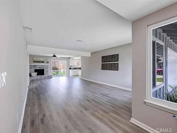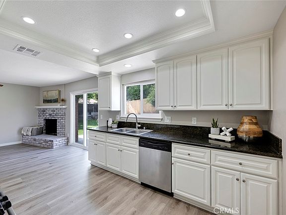 This beautiful single-story home welcomes you into the living room with freshly painted walls, luxury vinyl plank (LVT) flooring, and an updated whitewashed fireplace providing a cozy, yet modern feel. The abundant natural light flooding in through the newer sliding glass door and windows creates a warm and inviting atmosphere in the home. Adjacent to the living room is the bright and open kitchen with LED recessed lighting, granite countertops and stainless-steel appliances adding to the homes charm and functionality, making meal preparation a breeze!
