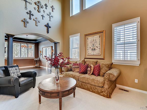Gorgeous updated home in Saddle Rock Golf Club South built by Alpert Homes. This home is model like with custom colors, plantation shutters, updated kitchen with ss appliances and granite. You'll find a unique main floor study with 12' high ceilings with french doors overlooking the new covered front porch and manicured yard. Beautiful spiral staircase, lots of hardwood flooring on main level and traffic areas. I love the main floor family room with 20'+ high ceilings which overlooks not only the beautifully updated kitchen but the gorgeous backyard patio/deck and incredibly private backyard. Upstairs you'll find your huge master suite with a customized 5 pc. master bath, and the most incredible walk in closet!! (Closet by Design), guest suite with private 3/4 bath, and 2 add'l bedrooms with jack and jill bath. "hardwood floors upstairs hallway!!" Please don't overlook the basement, 2 more beds/use as like, family room/rec room, exercise area and full bathroom. For you car lovers we've got a finished 3 car garage with great built ins and visitor parking directly across the street. You'll love this location. Visit us today as this home truly is in show home condition!